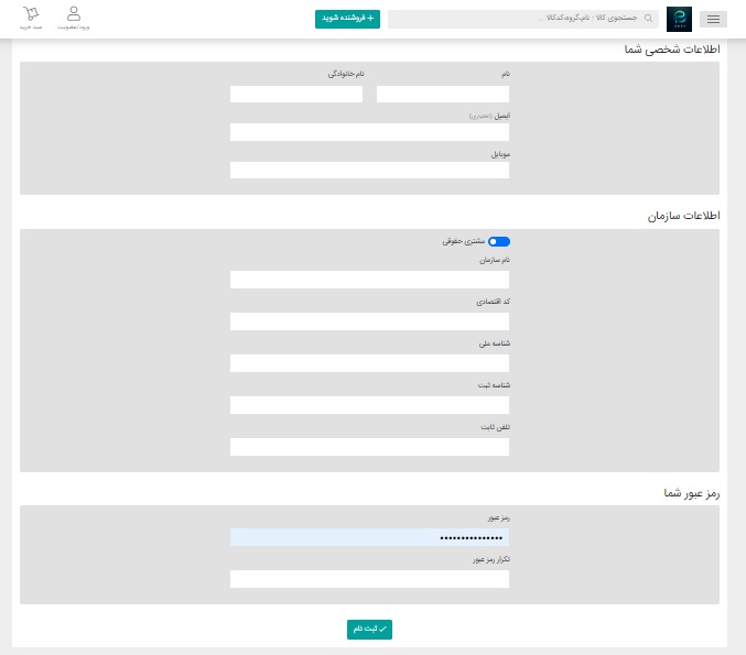 پس از عضویت باید درخواست فروشندگی خود را ثبت کنید این کار را میتوانید از طریق دکمه “فروشند شوید“ در بالای صفحه یا در پائین صفحه اصلی با کلیک بردکمه “درخواست حساب فروشنده“ انجام دهید.