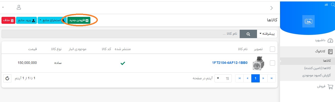 سپس روی دکمه “کالاها“ کلیک کنید. با باز شدن صفحه کالاها، تمام کالاهای ثبت شده شما بصورت لیستی نشان داده میشوند و شما میتوانید مشخصات آنها را تغییر داده یا حتی حذف کنید. در صورتی که میخواهید محصول جدیدی را وارد کنید باید روی دکمه سبز رنگ “افزودن جدید“ کلیک کنید.