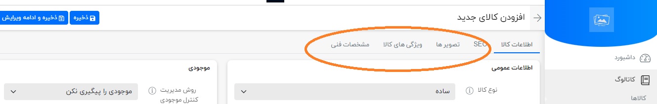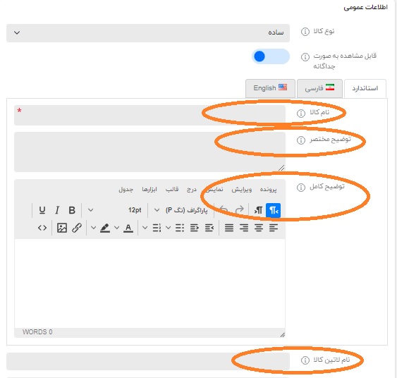 “توضیح کامل“: شامل تمام اطلاعات فنی محصول میشود که یا دستی پر میشود یا از کاتالوک کپی میشود.( توجه داشته باشید که در محدوده توضیح کامل فقط با زدن دکمه Ctrl+V در لپ تاپ میتوانید اطلاعات را منتقل کنید)