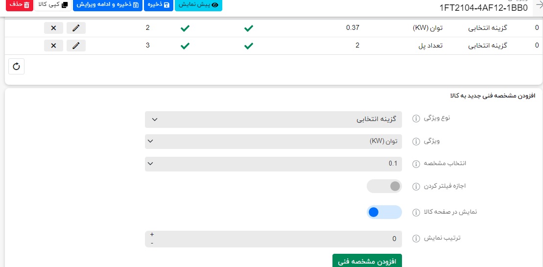 دوباره به بالای صفحه بروید و روی دکمه “مشخصات فنی“ کلیک کنید.این ویژگی ها شامل مشخصات فنی مهم کالا میباشد. نوع ویژگی گزینه انتخابی باید باشد. ویژگی مربوطه شامل کیلوات، نوع نصب، تعداد پل،.... را از لیست انتخاب کنید. مقدار ویژگی مانند اندازه کیلووات را از لیست “انتخاب مشخصه“ انتخاب کنید. دکمه “افزودن مشخصه فنی“ را کلیک کنید.