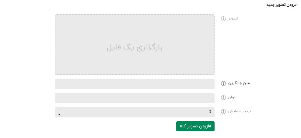 با کلیک بر روی “تصویرها“ صفحه زیر برای شما باز میشود. روی قسمت “بارگذاری یک فایل“ کلیک کنید تا پنجره انتخاب تصویر باز شود. پس از دانلود تصویرحتما باید بر روی دکمه “افزودن تصویر کالا“ در پائین صفحه کلیک کنید تا تصویر به لیست تصاویر اضافه شود