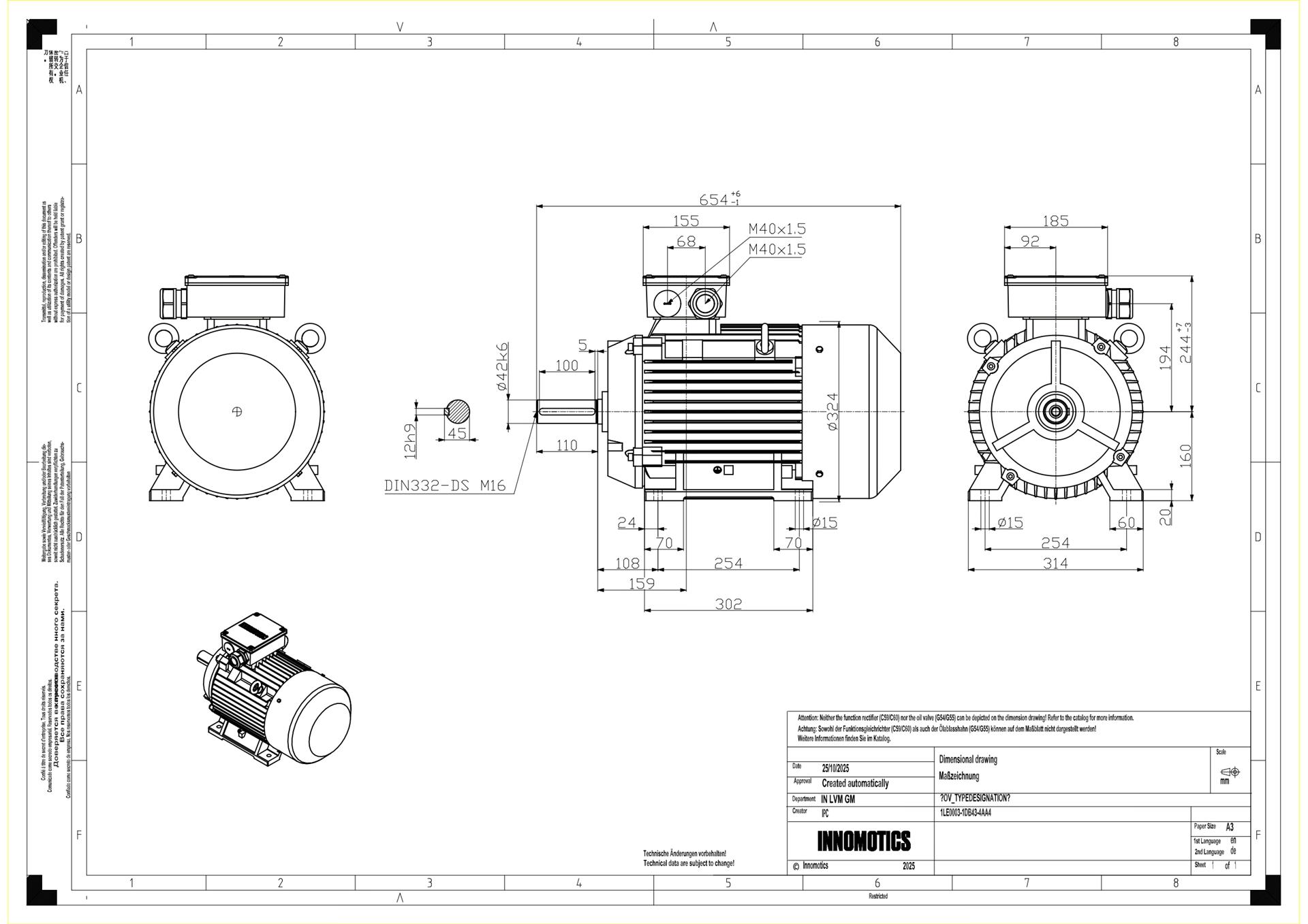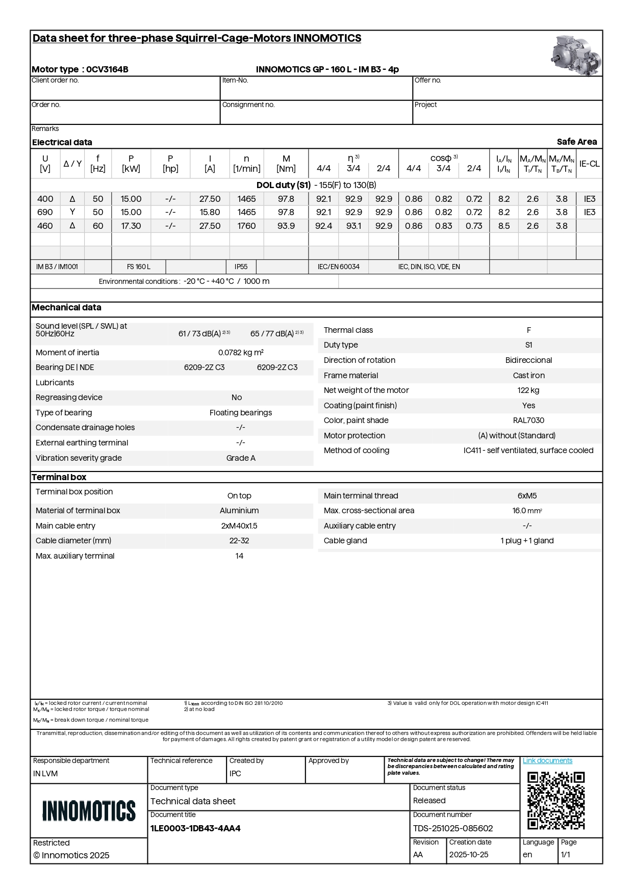 15KW, 4POLE, FS 160L, Class F, IP55, IMB3, IE3, ASL1000m, 400/690V, IC411