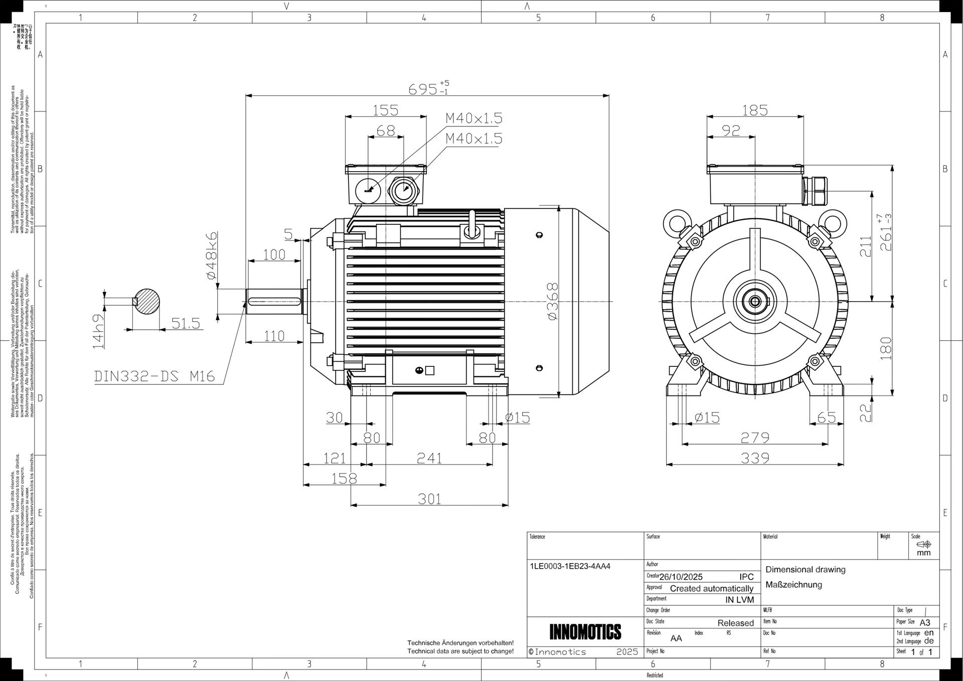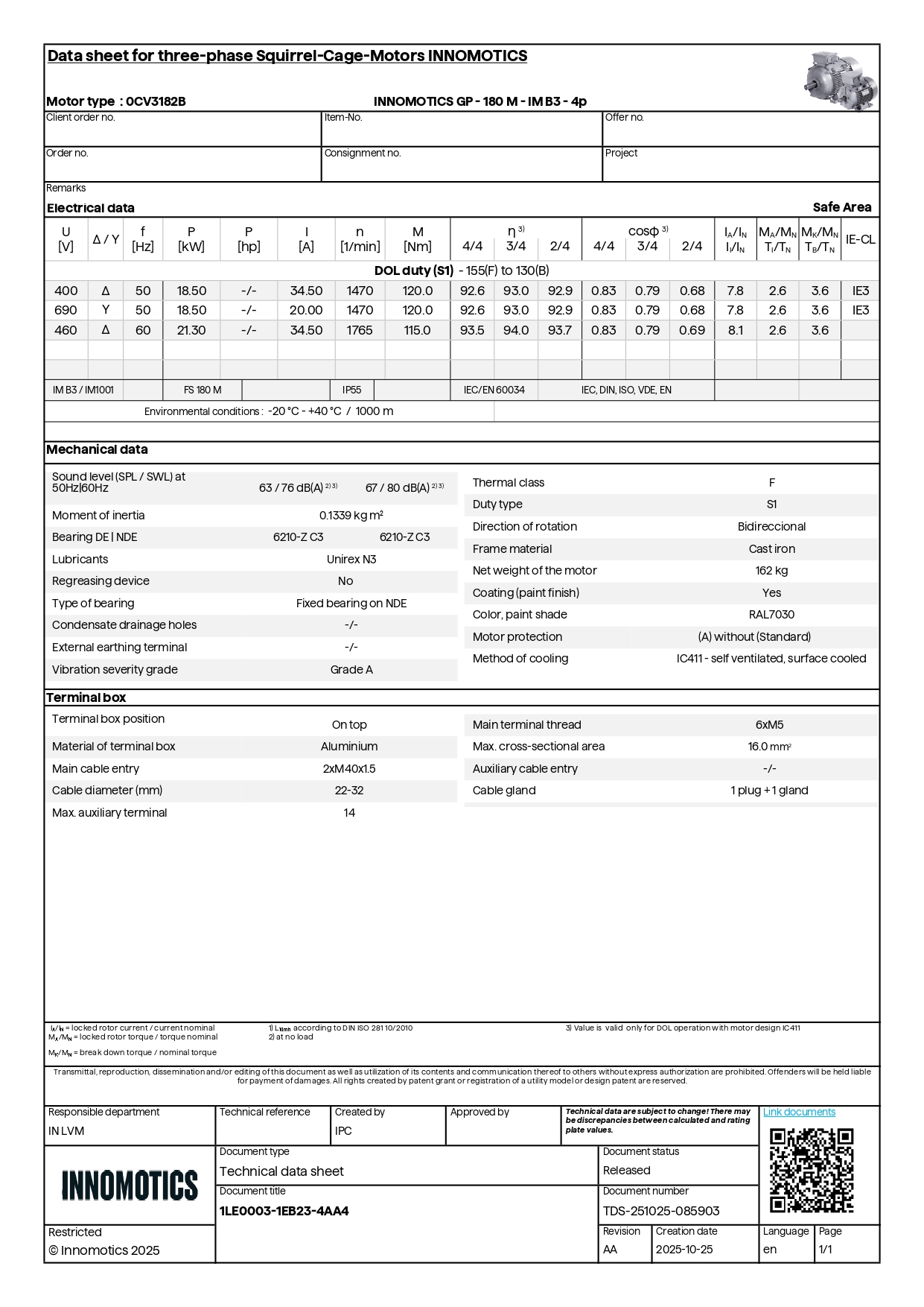 18.5KW, 4POLE, FS 180M, Class F, IP55, IMB3, IE3, ASL1000m, 400/690V, IC411